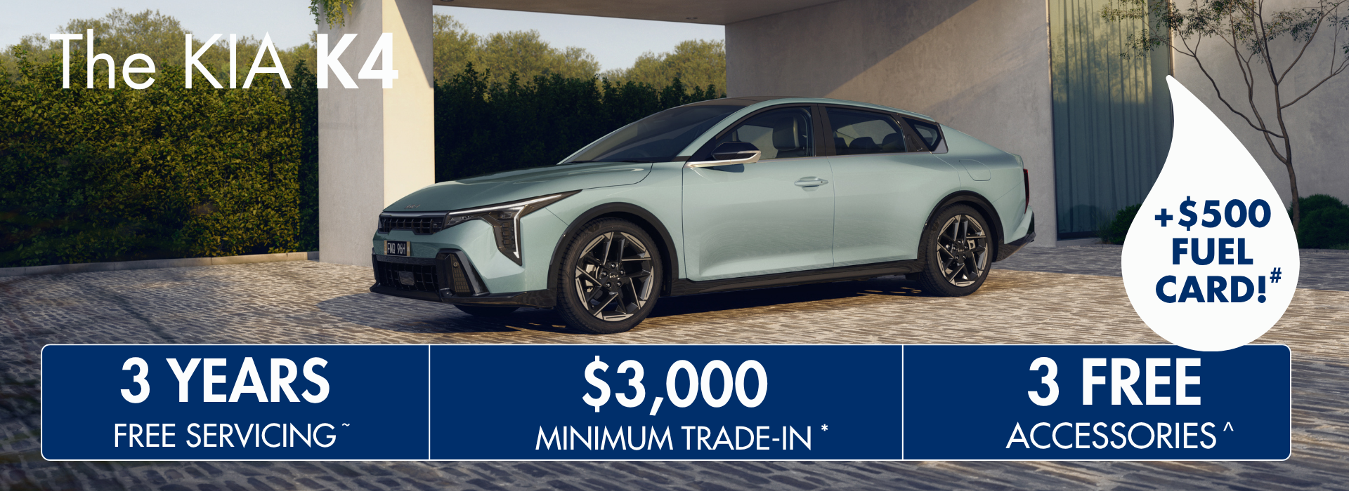 ~3 years free servicing offer only available at John Hughes Kia on new and demonstrator Kia K4 vehicles ordered and delivered between 01/03/2026 and 31/03/2026. While stocks last. Free servicing offer for 3 years or 45,000 kms (whichever occurs first) applies when all servicing is carried out at John Hughes Kia in accordance with the manufacturer’s service schedule. Not redeemable for cash or available to fleet, government or rental buyers or available with any other offer. John Hughes Kia reserves the right to extend, modify or withdraw this offer in its sole discretion.